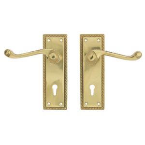 Georgian handles with a scroll lever available in latch, lock, bathroom and privacy variants for interior use only.