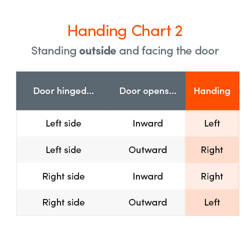 | Standing Outside, Door Hinged | Door Opens | Handing |