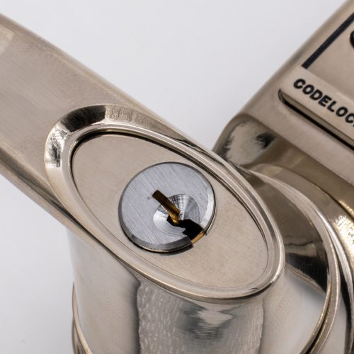 Codelock CL4010 is a medium-duty lock. The outside lever turns freely without operating the latch bolt. When a valid code is entered and the blue LED lights, the lever will retract the latch bolt. When the door closes the spring latch will automatically lock the door. The key will open the door for management functions. The key may be used to set the lock into Code Free mode so that anyone can open the door without using a code. Code Free Mode can also be programmed at the keypad using the Master Code.