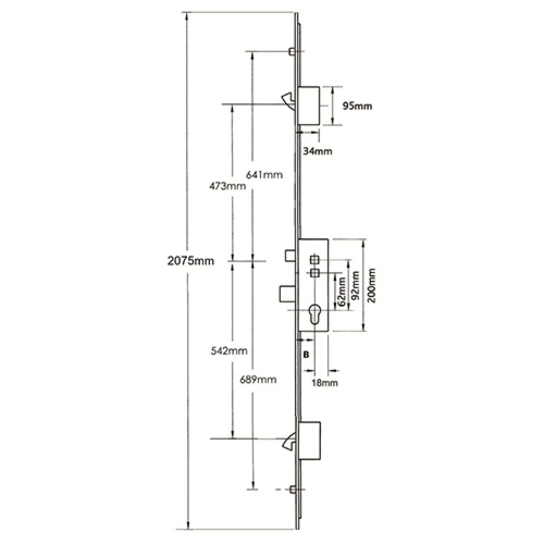 Centres are positioned at 62mm and 92mm with the top spindle being 122mm from the bottom of the case. Single spindle locks have a round hole where the second spindle would usually be located. The gearbox is pierced to accept a bolt through fixing 19mm from the top spindle, and the slot above for fixings is 42mm above the spindle.