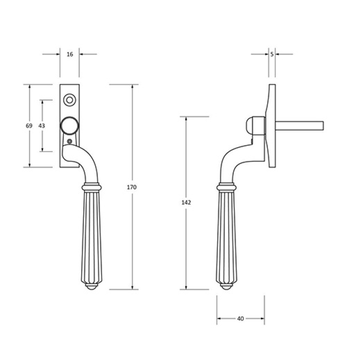 The product is handed and therefore care needs to be taken when choosing the correct hand. From the inside view, if your window is hinged on the left then a left-hand fastener is required. They have a 7mm x 40mm spindle and can be locked by way of a grub screw. Suitable for use with an espagnolette gearbox and window lock.