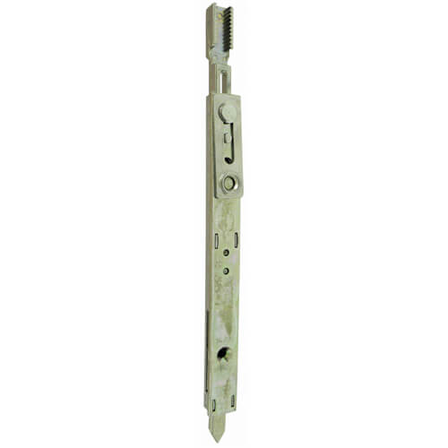 A GU reverse action bottom shootbolt for use with GU multipoint locks with serrated drive rods.