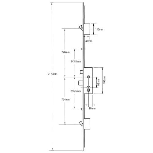 GU multipoint lock gearboxes feature a latch and deadbolt and measure 191mm high (excluding the fixing lugs) by the backset + 16mm wide. The latch is 32mm high, the deadbolt measures 35mm high and there is 54mm from the bottom of the latch to the top of the deadbolt.