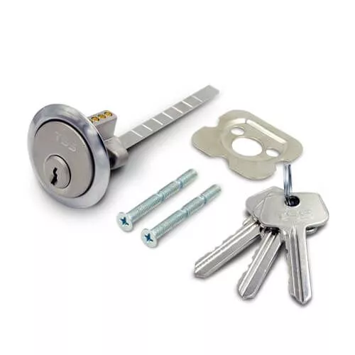 The TSS 6 Pin Rim cylinder is a cost effective replacement rim cylinder which can be used to replace most other rim cylinders at a reduced price. Supplied with 3 keys and available in either Brass or Satin Nickel finishes, these cylinders represent excellent value without compromising on features or quality. With a 70mm croppable tail piece this cylinder is supplied boxed with 2 retaining screws and mounting plate. This is the same cylinder supplied as standard with the TSS 6 pin range of nightlatches. This 6 pin version offers an increased level of security featuring ant pick and anti drill protection, and 6 pins to help defend against manipulation.