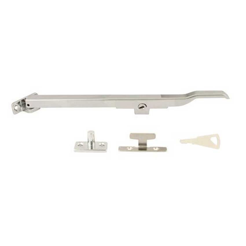 This casement stay is supplied as a complete kit with stay arm, locking clip, key, pin, and fixing screws.
