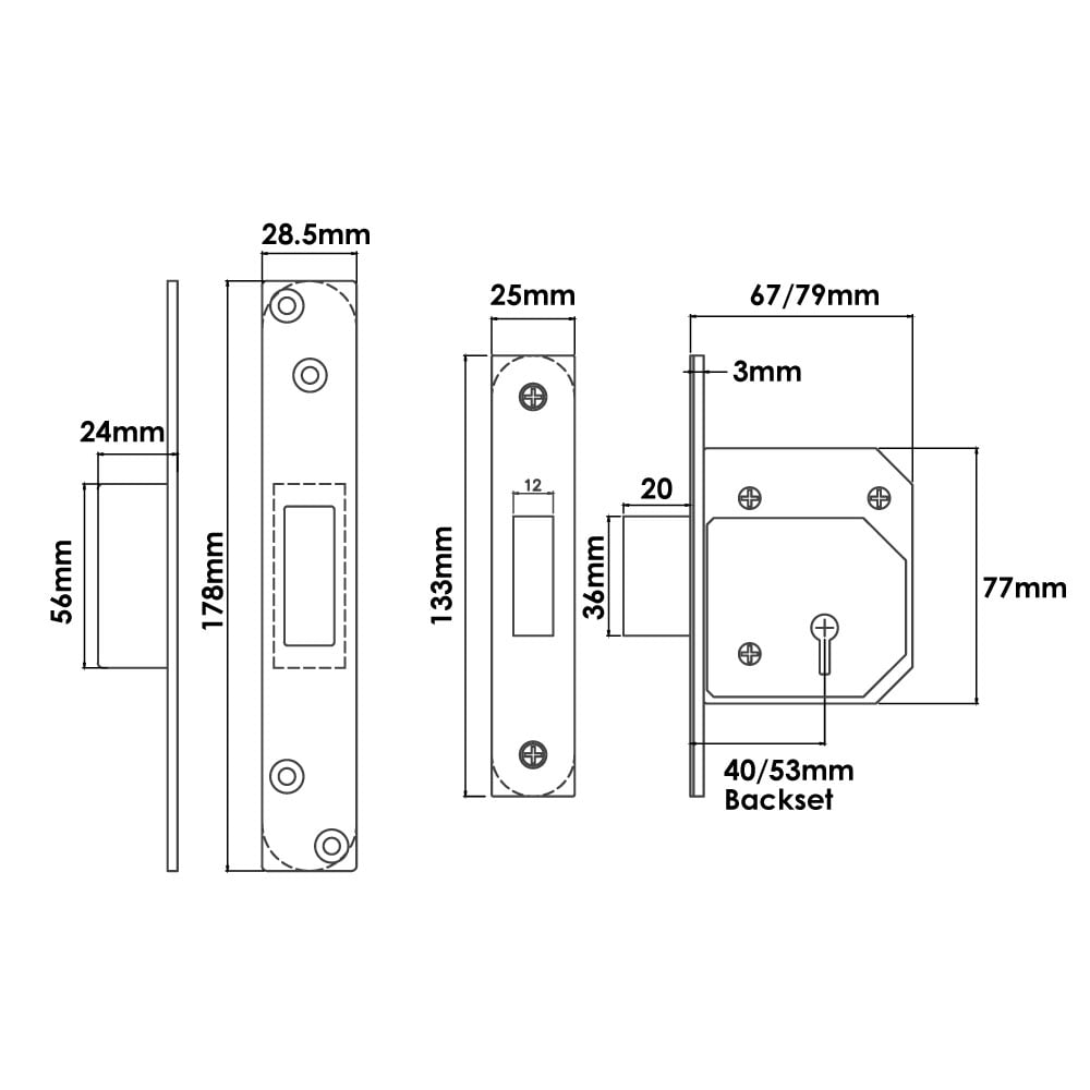 These locks feature a blue lock case but they have unique measurements that identify them from other mortice locks. While the case width features standard 67mm (2.5″) and 79mm (3″) sizes, the backset measures just 40mm on the 67mm width case and 53mm on the 79mm width case. Please refer to the line drawing for details.