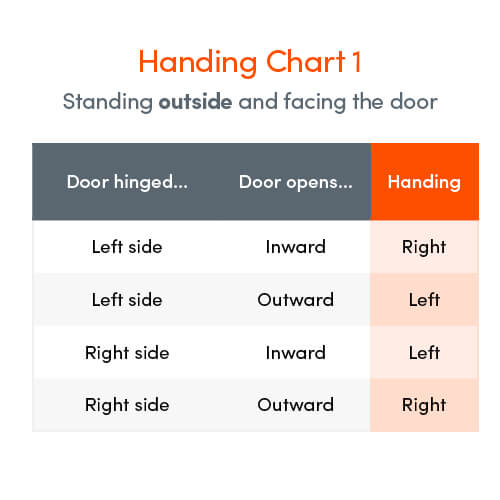 | Standing Outside, Door Hinged | Door Opens | Handing |